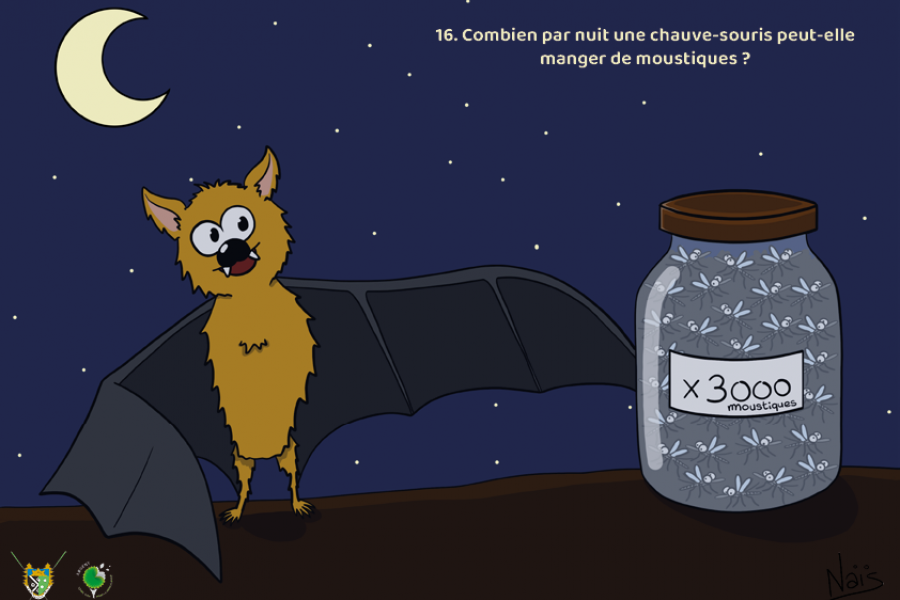 3000. En moyenne, chaque nuit, une chauve-souris dévore l’équivalent en poids de 3000 moustiques. De manière générale, la chauve-souris insectivore se nourrit quotidiennement d’un tiers de son poids en insectes. Certaines peuvent ingurgiter de bien plus grandes quantités, jusqu’à l’équivalent de leur poids total.