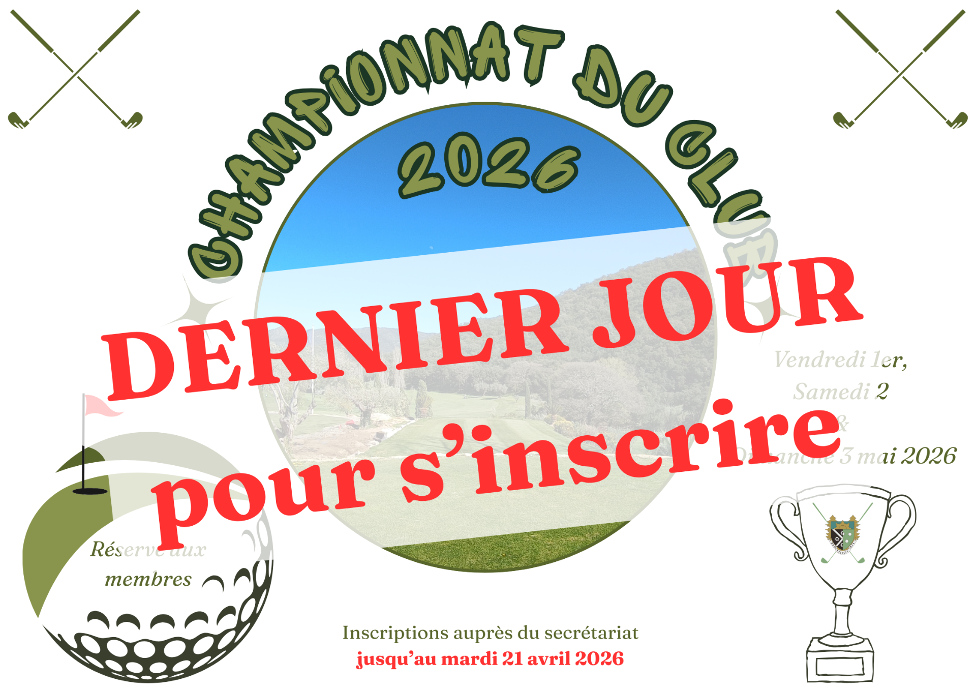 Le Club House reste ouvert et maintient le service minimum de restauration en cas de pluie et/ou de fermeture de parcours.
