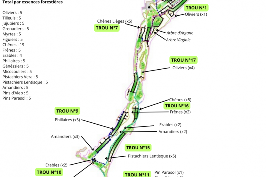 C’est dans cet objectif, conformément au programme et selon le cahier des charges du projet (dimensions, espèces, disposition...), qu’une centaine d’essences méditerranéennes viendra enrichir la zone forestière de notre parcours.